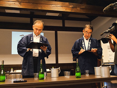 両蔵の原酒を調合した3種類のお酒から、今秋発売するお酒を5人の審査担当者がきき酒を行い、投票にて決定。